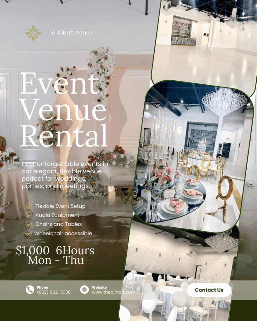 At The Allnatt, we believe every celebration deserves a setting as special as the memories you’ll create. Our Houston-based venue blends elegance, comfort, and flexibility—designed to host everything from intimate gatherings to grand events.
